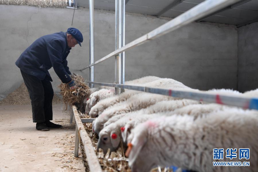 在古浪縣黃花灘生態(tài)移民區(qū)富民新村養(yǎng)殖小區(qū),村民李應川在喂羊(3月10日攝)。新華社記者 范培珅 攝