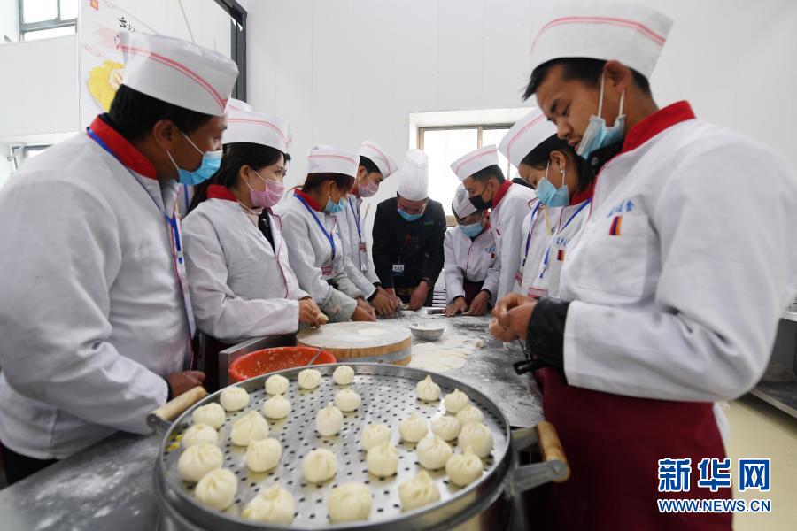 東鄉(xiāng)縣職業(yè)技術學校中式烹飪培訓班學員在學習包子制作技能(4月21日攝)。新華社記者 范培珅 攝