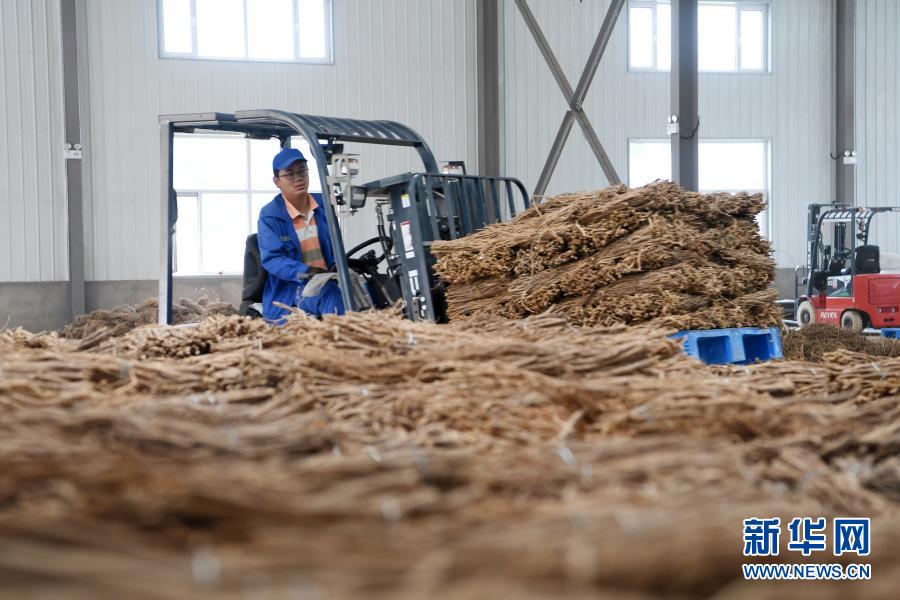 在宕昌縣哈達鋪琦昆現(xiàn)代中藥材倉儲物流基地,工作人員使用叉車搬運中藥材(9月18日攝)。新華社記者 范培珅 攝