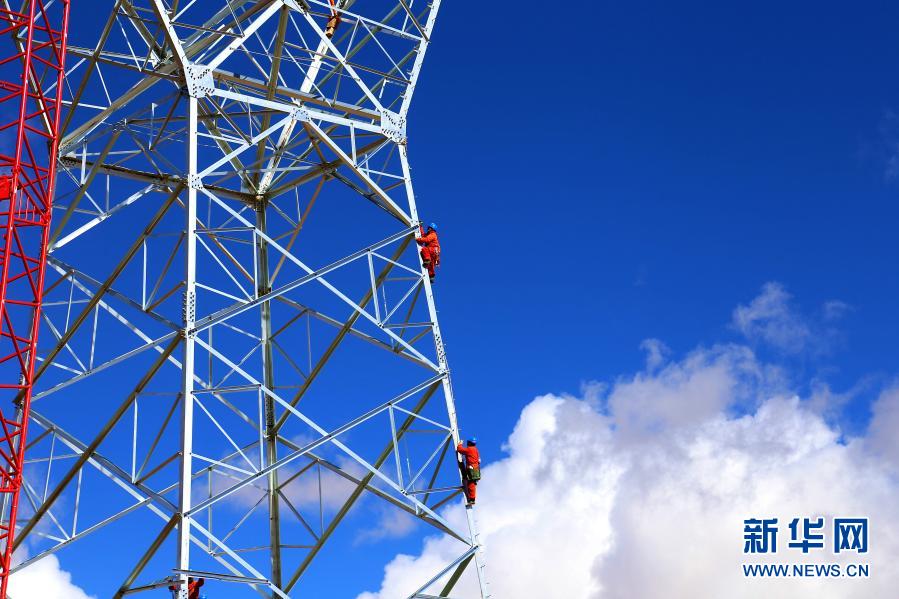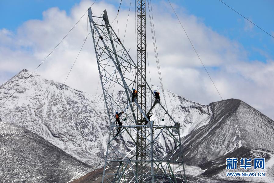 在西藏阿里地區(qū)噶爾縣,施工人員在西藏阿里與藏中電網聯網工程線路13標段進行組塔作業(yè)(3月29日攝)。新華社發(fā)