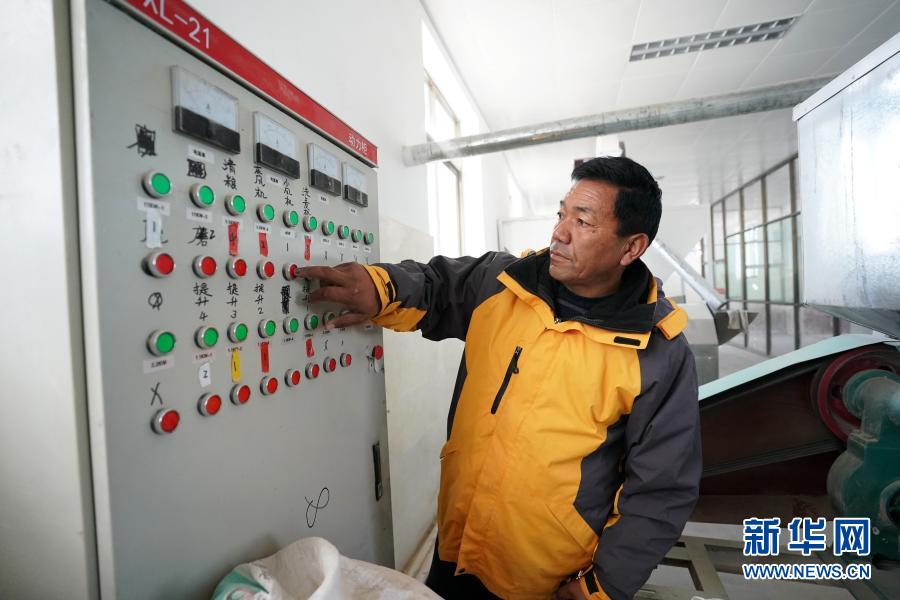 在西藏阿里地區(qū)普蘭縣普蘭西德稞原地食品有限公司,工作人員在糌粑加工車間查看設備運行情況(11月28日攝)。新華社記者 詹彥 攝
