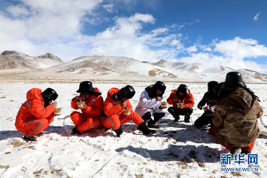 在西藏阿里地區(qū)噶爾縣,施工人員在西藏阿里與藏中電網聯網工程線路13標段吃午飯(2019年12月21日攝)。新華社發(fā)