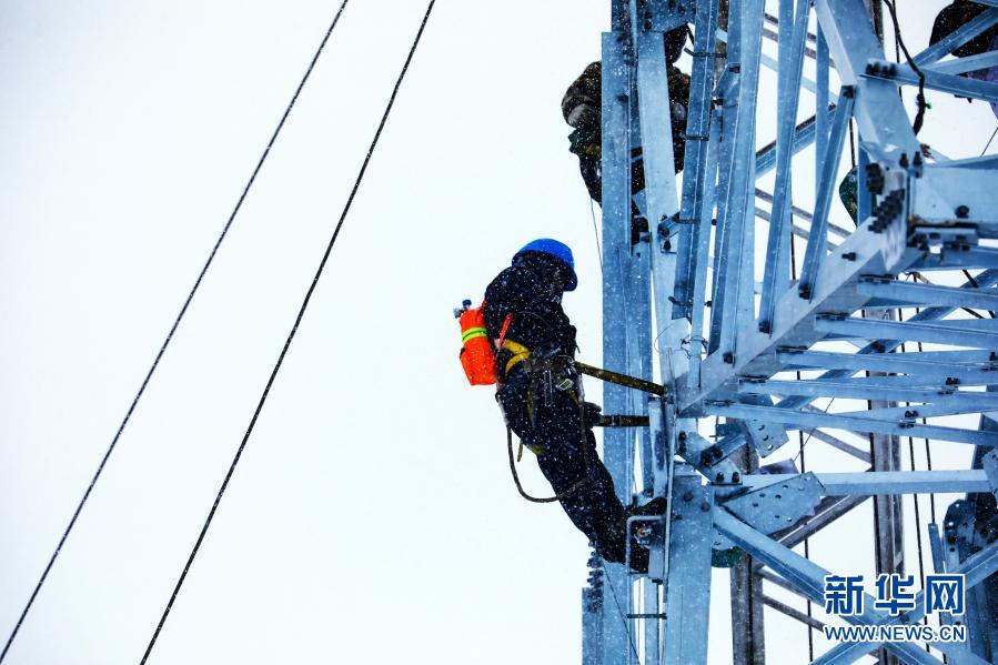 在西藏日喀則市定日縣,西藏阿里與藏中電網聯網工程線路4標段施工人員在暴風雪中作業(yè)(5月2日攝)。新華社發(fā)