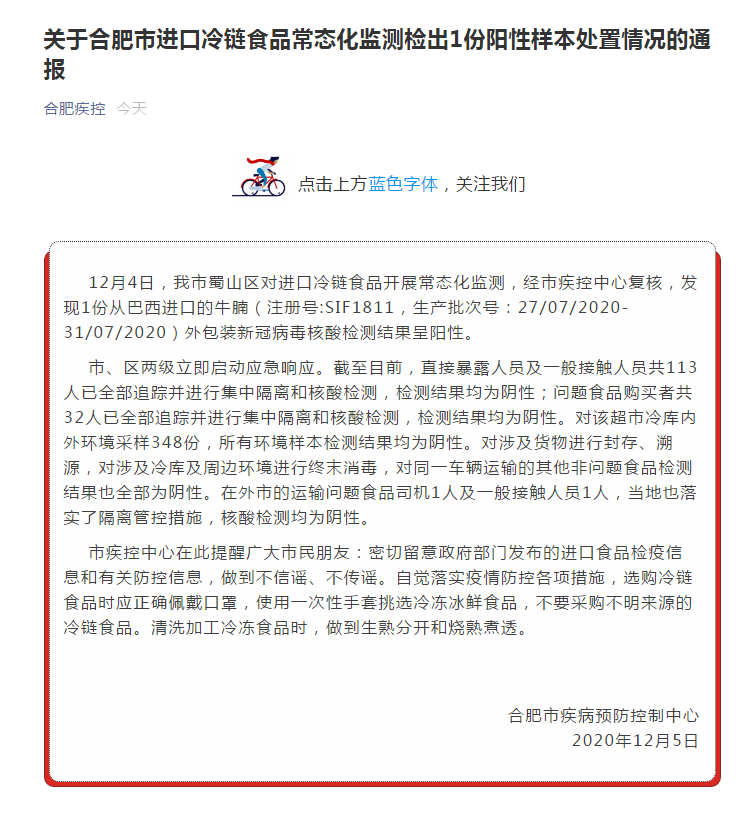 12月4日,合肥市蜀山區(qū)對(duì)進(jìn)口冷鏈?zhǔn)称烽_(kāi)展常態(tài)化監(jiān)測(cè),經(jīng)市疾控中心復(fù)核,發(fā)現(xiàn)1份從巴西進(jìn)口的牛腩(注冊(cè)號(hào):SIF1811,生產(chǎn)批次號(hào):27/07/2020-31/07/2020)外包裝新冠病毒核酸檢測(cè)結(jié)果呈陽(yáng)性。