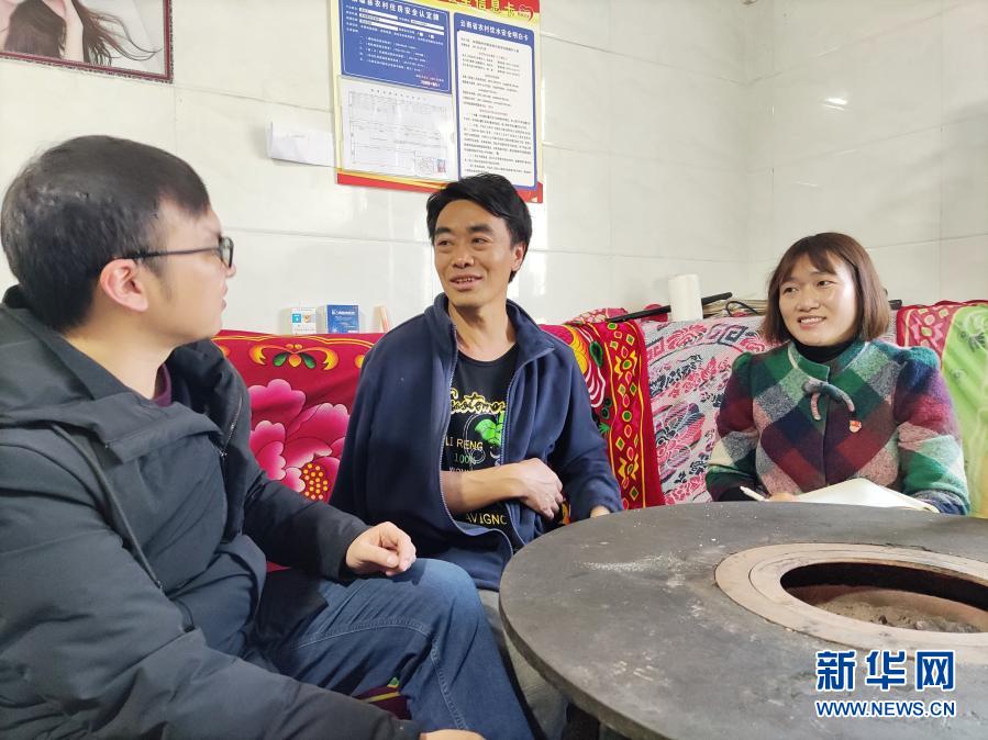 11月12日,云南省鎮(zhèn)雄縣以古鎮(zhèn)巖洞腳村駐村第一書(shū)記郭登會(huì)(右)和扶貧隊(duì)員到村民趙慶元(中)家里走訪。新華社記者 林碧鋒 攝