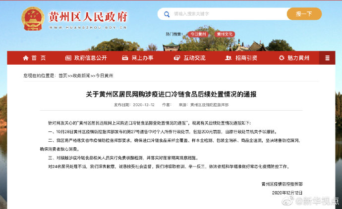 湖北省黃岡市黃州區(qū)人民政府網(wǎng)站12日發(fā)布通報(bào),撤銷對網(wǎng)購涉疫進(jìn)口冷鏈?zhǔn)称穫€人所作的行政處罰,包括200元罰款。 ????