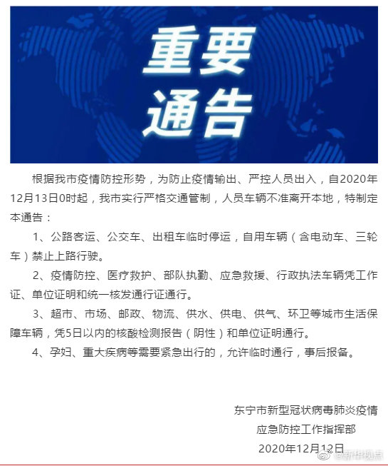 黑龍江東寧市新型冠狀病毒肺炎疫情應(yīng)急防控工作指揮部消息:根據(jù)東寧市疫情防控形勢(shì),為防止疫情輸出、嚴(yán)控人員出入,自2020年12月13日0時(shí)起,東寧市實(shí)行嚴(yán)格交通管制,人員車輛不準(zhǔn)離開(kāi)本地。