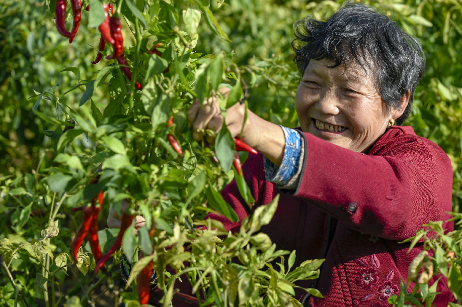 ????2018年拍攝于陜西興平桑鎮(zhèn)永流村,農(nóng)民采摘辣椒,辣椒喜獲豐收,農(nóng)民露出喜悅的笑容。(組照1)張綺云 攝