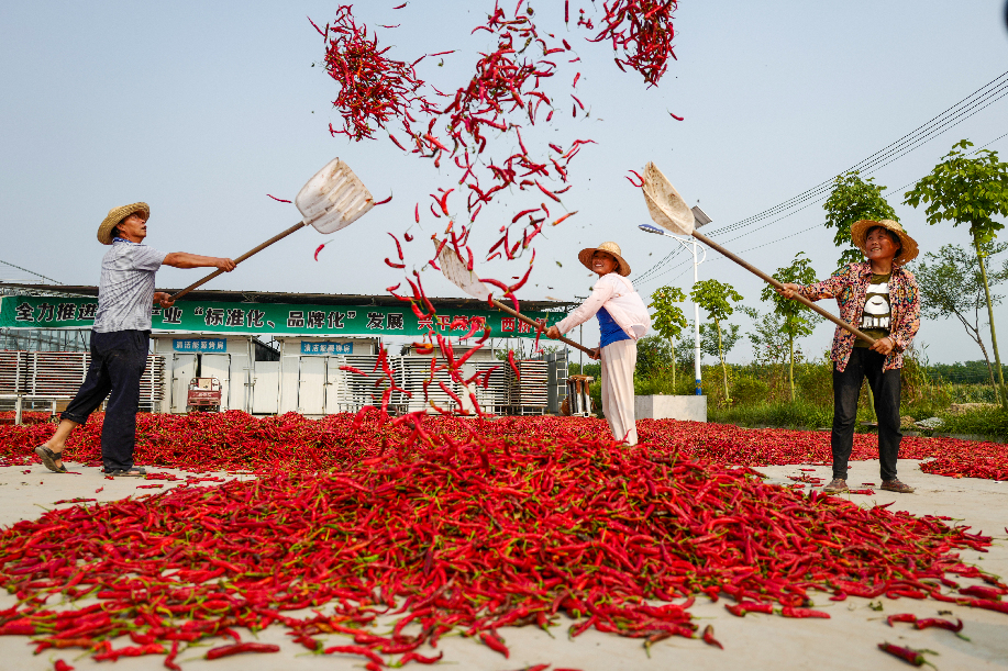 ??????2020年拍攝于陜西興平桑鎮(zhèn)西橋村金鵬辣蒜專業(yè)合作社,農(nóng)民將辣椒揚(yáng)起晾曬。(組照4)張綺云 攝