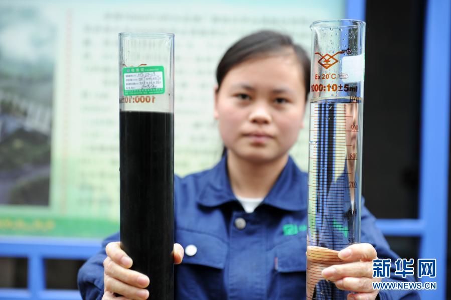 貴州省仁懷市茅臺(tái)酒廠污水處理廠的工人展示污水處理前后的水質(zhì)對(duì)比效果(2018年10月23日攝)。新華社記者 楊文斌 攝