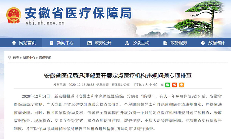 據(jù)安徽省醫(yī)保局網(wǎng)站消息,2020年12月14日,新京報(bào)報(bào)道《安徽太和多家醫(yī)院疑騙保:沒(méi)病變“腦?!保腥艘荒昝赓M(fèi)住院9次》后,安徽省醫(yī)保局高度重視,當(dāng)天立即與省衛(wèi)健委組成聯(lián)合檢查督導(dǎo)組,全程跟蹤督導(dǎo)太和縣迅速?gòu)氐撞榍暹`規(guī)事實(shí),嚴(yán)格依法依規(guī)處理。