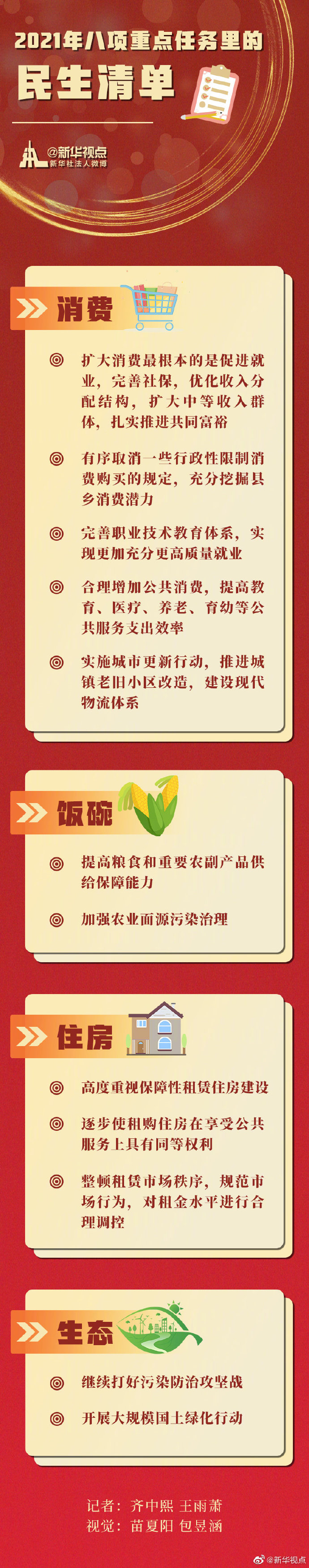保障和改善民生始終是經(jīng)濟工作的重點。中央經(jīng)濟工作會議規(guī)劃的2021年八項重點任務(wù)中,涉及民生的內(nèi)容占有相當篇幅。記者從中梳理出這樣一份“民生清單”,件件都與你我相關(guān)—— ?????