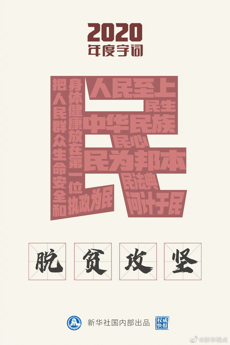 “民”當選2020年度“國內(nèi)字”;“脫貧攻堅”當選2020年度“國內(nèi)詞”。國家語言資源監(jiān)測與研究中心、商務印書館等21日發(fā)布“漢語盤點2020”年度字詞,定格我國年度記憶。這一年,從抗疫抗洪到民法典誕生、謀劃開啟“十四五”新征程,處處閃耀“人民至上”理念;這一年,如期完成脫貧攻堅目標任務,千年夙愿,今朝夢圓!?