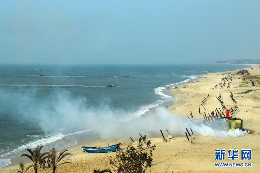 陸軍第72集團(tuán)軍某旅組織陸空一體實(shí)兵演練,藍(lán)軍投放煙霧彈干擾紅軍登陸(2017年8月20日攝)。新華社發(fā)(莊林毅 攝)
