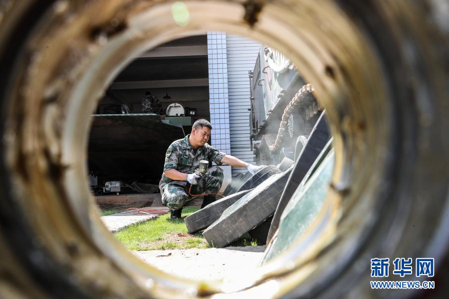 陸軍第72集團(tuán)軍某旅四級軍士長譚斌在車場維護(hù)保養(yǎng)裝備(2019年9月20日攝)。新華社發(fā)(王勝強(qiáng) 攝)