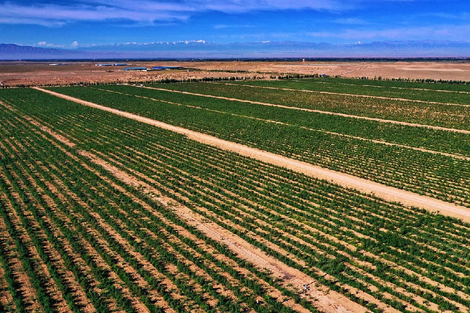 ????2020年7月19日,在甘肅省張掖市高臺(tái)縣黑泉鎮(zhèn)十壩村戈壁灘上,一眼望不到邊的枸杞種植基地,在祁連雪山的映襯下顯得蔚為壯觀。鄭耀德 攝
