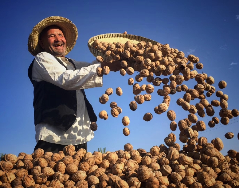 ????新疆喀什地區(qū)果農(nóng)正在開心地晾曬核桃。