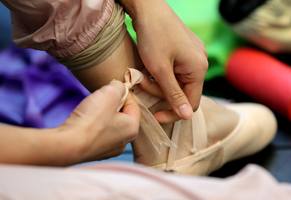 12月15日,項陽在基礎(chǔ)訓練課前綁足尖鞋。
