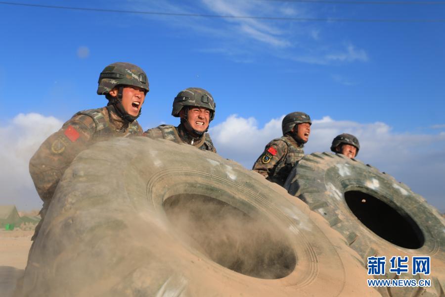 武警新疆總隊某機動支隊特戰(zhàn)一中隊組織官兵進行翻輪胎體能訓練(10月30日攝)。新華社發(fā)(張文 攝)
