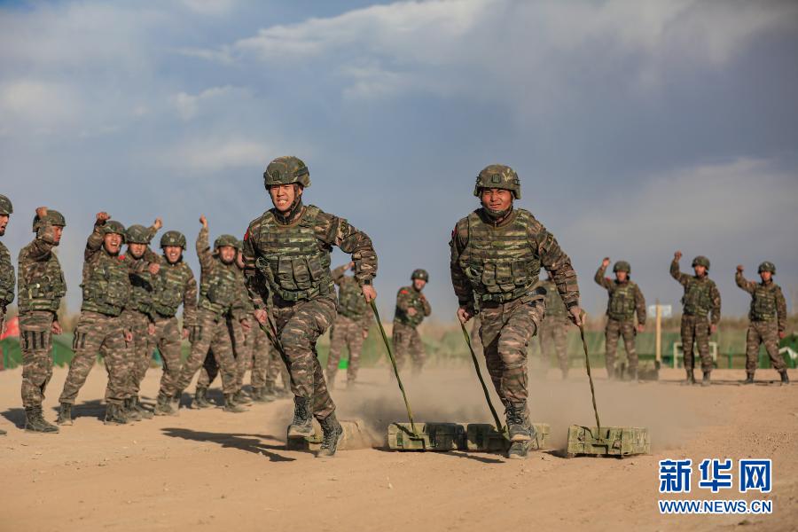 武警新疆總隊某機動支隊特戰(zhàn)一中隊組織官兵進行搬運子彈箱體能訓練(10月30日攝)。新華社發(fā)(張文 攝)