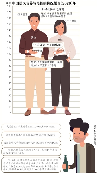 根據(jù)發(fā)布數(shù)據(jù),目前我國(guó)18歲及以上居民男性和女性的平均體重分別為69.6千克和59千克,與2015年發(fā)布結(jié)果相比分別增加3.4千克和1.7千克,超重肥胖問(wèn)題凸顯。