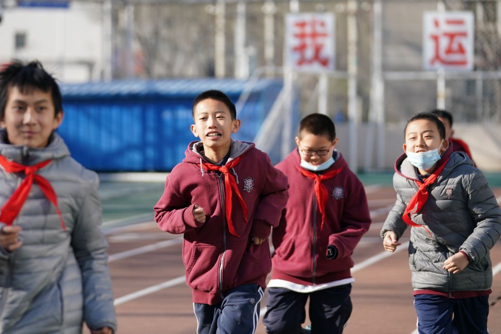 ??12月21日,在北京四中廣外校區(qū),蔡昊霖(左二)和同學一起上體育課。