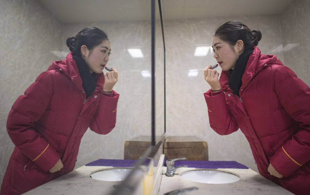 ??12月16日,武漢客運(yùn)段高鐵乘務(wù)員艾婷婷在上班前化妝。