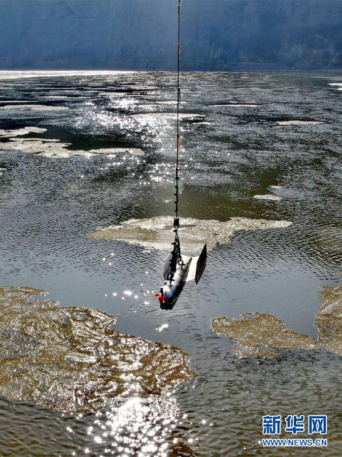 龍門(mén)水文站工作人員利用鉛魚(yú)纜道進(jìn)行流量測(cè)驗(yàn)(12月27日攝,無(wú)人機(jī)照片)。新華社記者 劉詩(shī)平 攝
