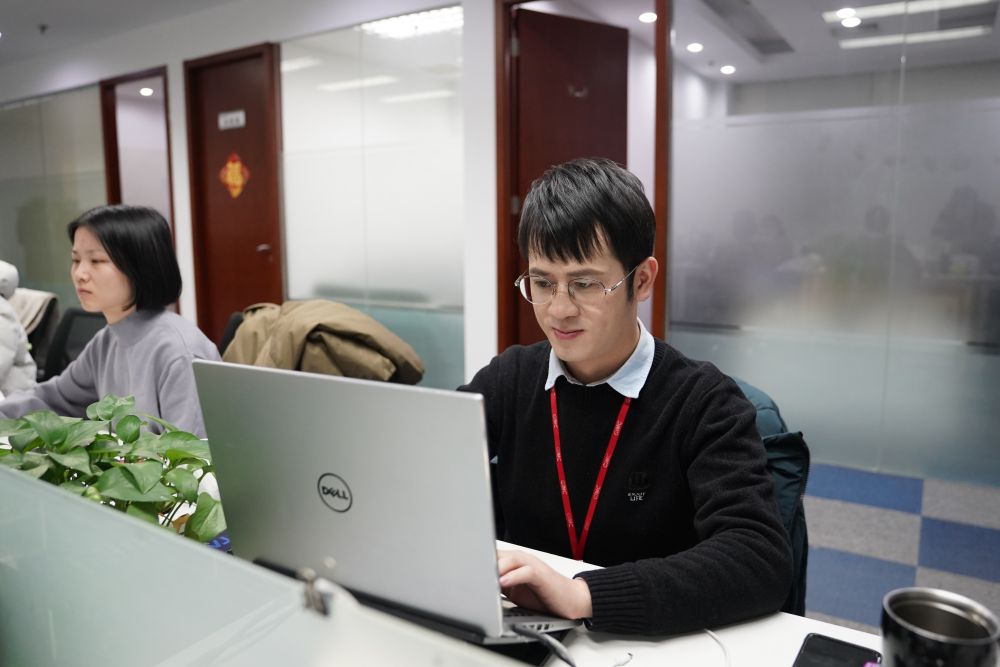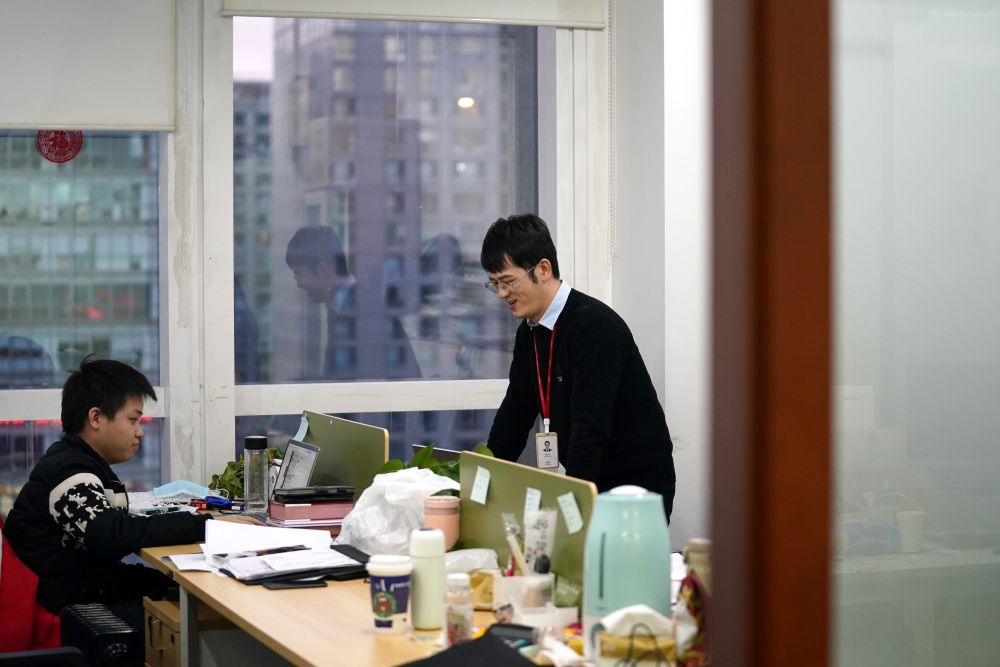 ??12月16日,在廣東省廣告集團(tuán)股份有限公司第二事業(yè)群北京中心,陳安心(右)在辦公室內(nèi)工作。