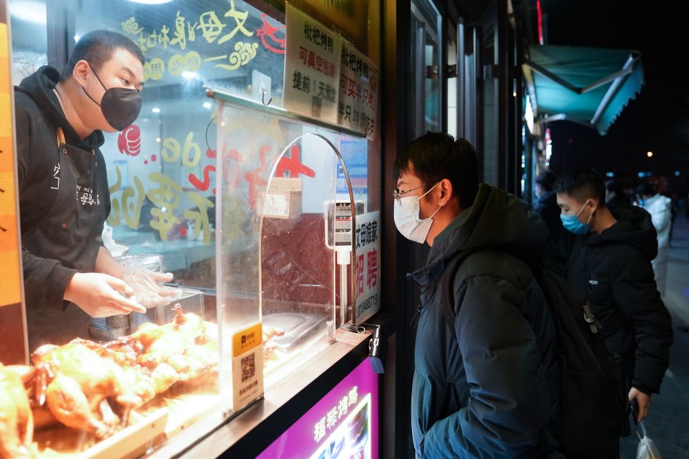 ??12月16日,陳安心(左二)回家路上購(gòu)買晚餐。