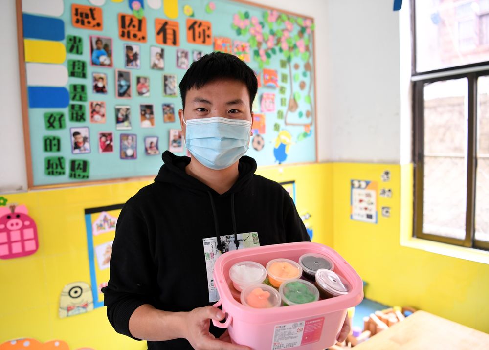 ??12月18日,孫浩在合肥鋼鐵集團(tuán)第一幼兒園展示手工課用品。