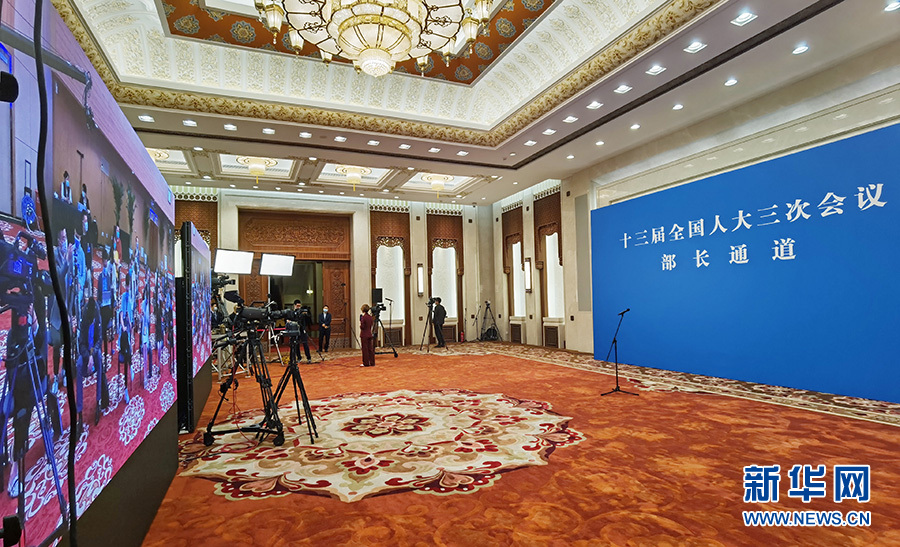5月22日,十三屆全國(guó)人大三次會(huì)議開幕會(huì)結(jié)束后,首場(chǎng)“部長(zhǎng)通道”采訪活動(dòng)在人民大會(huì)堂新聞發(fā)布廳舉行,邀請(qǐng)部分列席會(huì)議的國(guó)務(wù)院有關(guān)部委負(fù)責(zé)人通過(guò)網(wǎng)絡(luò)視頻方式接受采訪。圖為“部長(zhǎng)通道”現(xiàn)場(chǎng)。新華網(wǎng) 王翰林 攝
