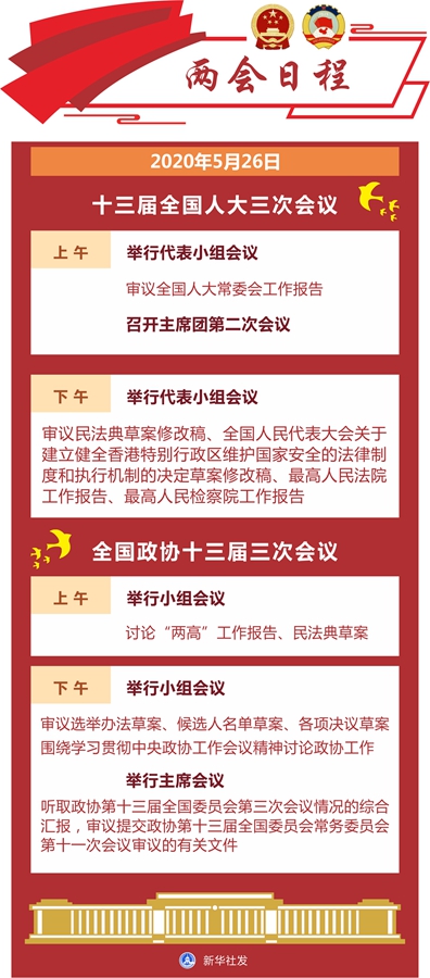 新華社北京5月25日電? 十三屆全國人大三次會議26日上午舉行代表小組會議,審議全國人大常委會工作報告;11時召開主席團(tuán)第二次會議。下午舉行代表小組會議,審議民法典草案修改稿、全國人民代表大會關(guān)于建立健全香港特別行政區(qū)維護(hù)國家安全的法律制度和執(zhí)行機(jī)制的決定草案修改稿、最高人民法院工作報告、最高人民檢察院工作報告。