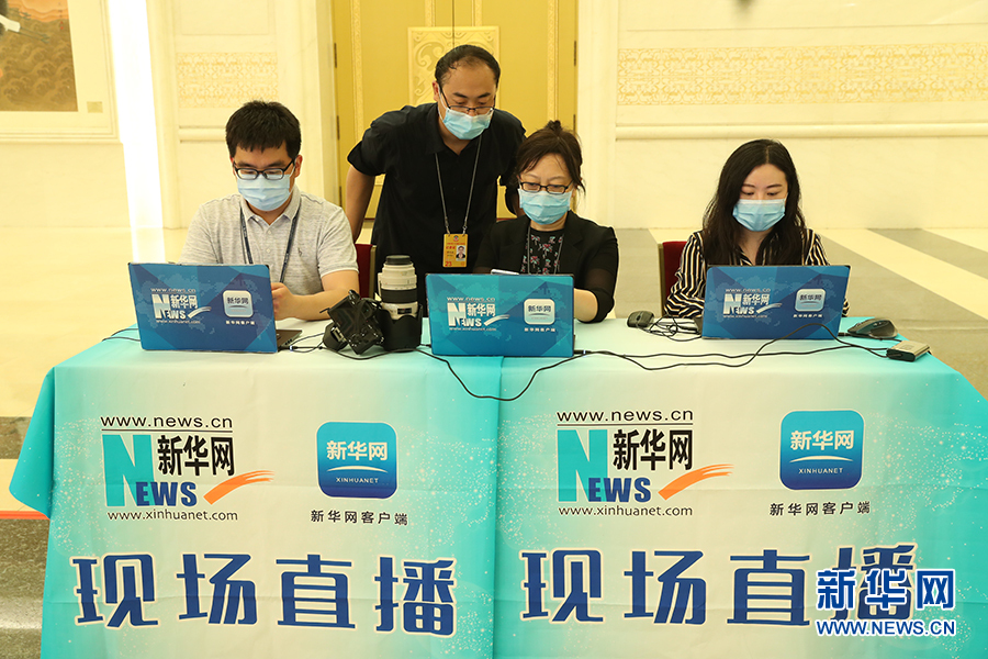 2020年5月28日下午十三屆全國人大三次會議閉幕后,國務院總理李克強在人民大會堂三樓金色大廳出席記者會并回答中外記者提問。為有效防控疫情,共同維護公共衛(wèi)生與健康,記者會采用網(wǎng)絡視頻形式進行。圖為新華網(wǎng)現(xiàn)場直播團隊。 新華網(wǎng) 王翰林 攝