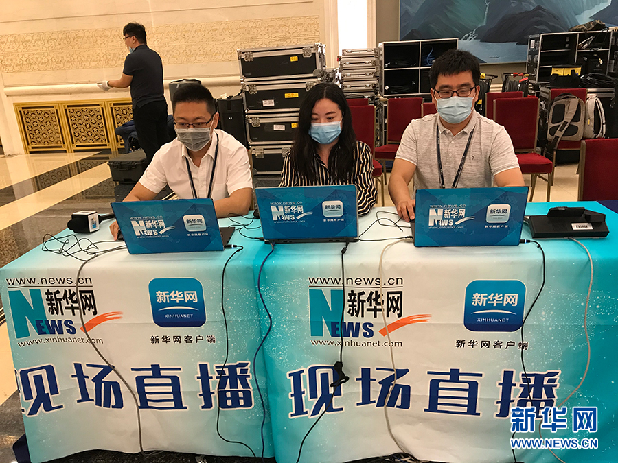 ??? 2020年5月28日下午十三屆全國(guó)人大三次會(huì)議閉幕后,國(guó)務(wù)院總理李克強(qiáng)在人民大會(huì)堂三樓金色大廳出席記者會(huì)并回答中外記者提問。為有效防控疫情,共同維護(hù)公共衛(wèi)生與健康,記者會(huì)采用網(wǎng)絡(luò)視頻形式進(jìn)行。圖為新華網(wǎng)現(xiàn)場(chǎng)直播團(tuán)隊(duì)。 新華網(wǎng) 王翰林 攝