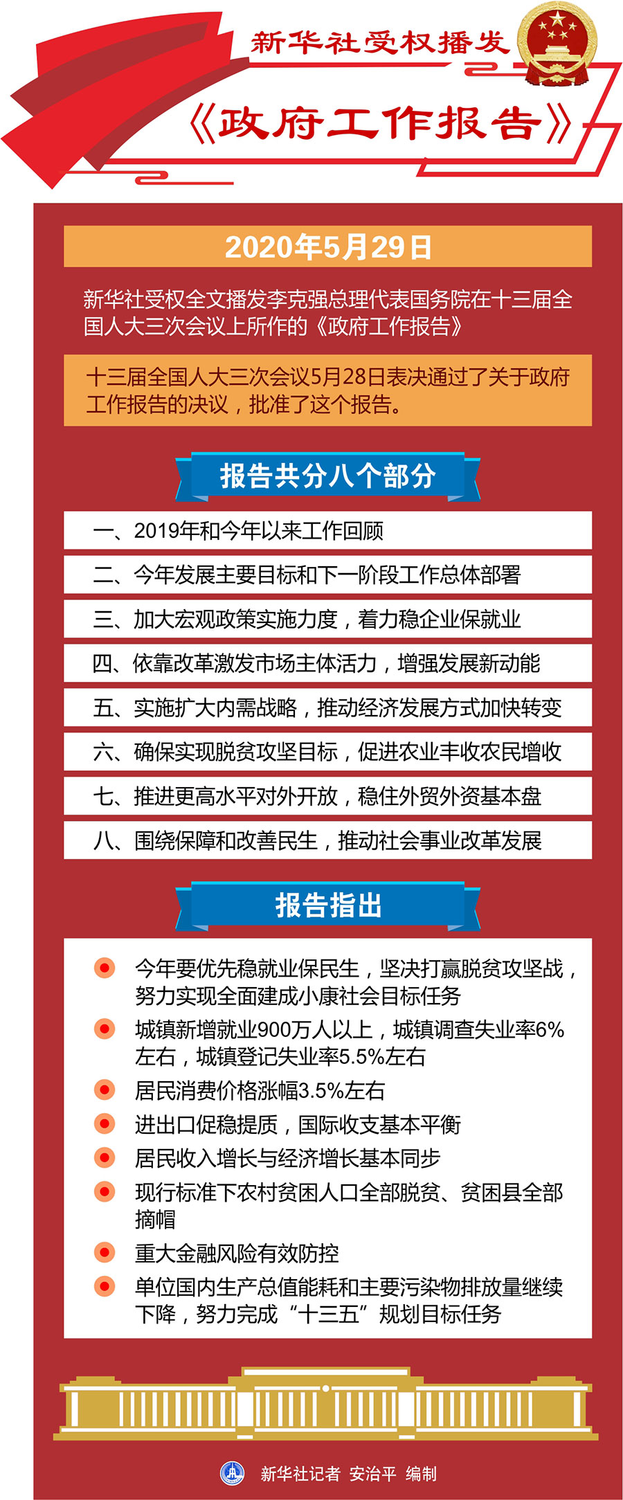 新華社北京5月29日電 新華社受權(quán)于29日全文播發(fā)李克強總理代表國務(wù)院在十三屆全國人大三次會議上所作的《政府工作報告》。十三屆全國人大三次會議5月28日表決通過了關(guān)于政府工作報告的決議,批準(zhǔn)了這個報告。