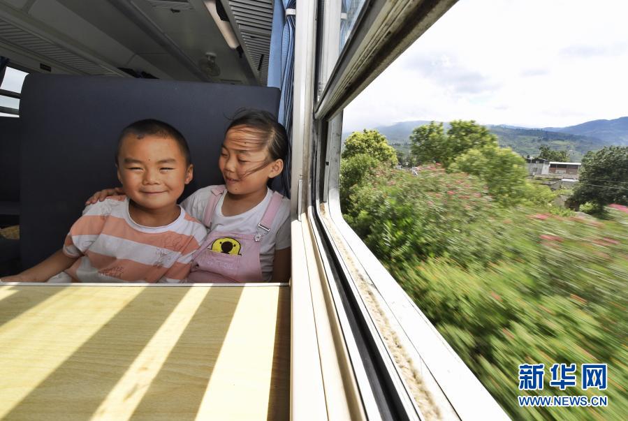 2020年8月14日,吳思語(右)帶著弟弟吳思遠乘坐“小慢車”前往西昌走親戚。穿越四川涼山彝族自治州往返于普雄和攀枝花之間的5633/5634次列車,全列13節(jié)車廂,走滿全程353公里需要9個多小時。慢悠悠的火車沿途要停靠26個站,如同一座流動的村莊,盡自己最大能力解決沿途百姓出行問題。
