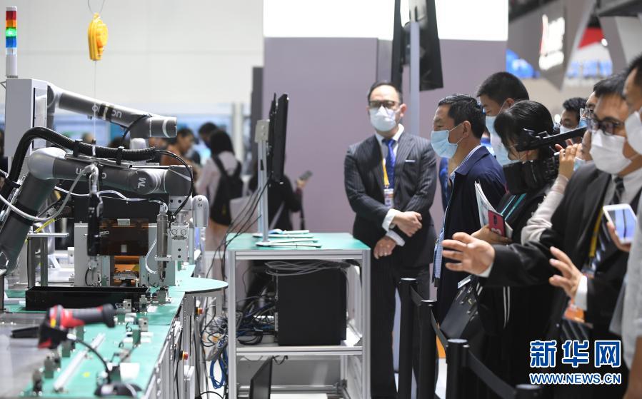 2020年11月6日,在進(jìn)博會(huì)技術(shù)裝備展區(qū),人們在西門子展臺(tái)觀看人機(jī)協(xié)作的智能化單元生產(chǎn)線。新華社記者 李任滋 攝