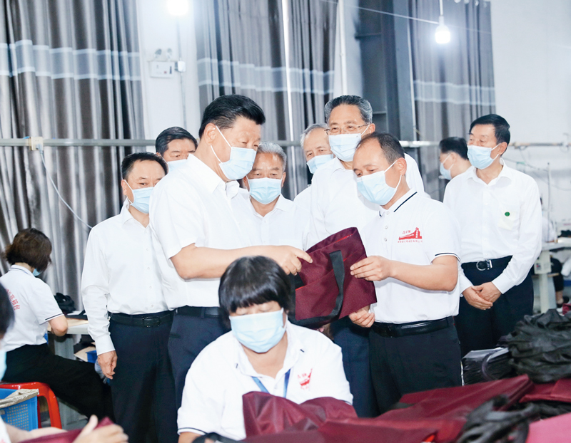 2020年8月18日至21日,中共中央總書記、國家主席、中央軍委主席習(xí)近平在安徽省考察。這是18日下午,習(xí)近平在阜陽市阜南縣紅亮箱包有限公司察看車間生產(chǎn)線,了解企業(yè)災(zāi)后恢復(fù)生產(chǎn)和受災(zāi)群眾、貧困群眾就業(yè)情況。 新華社記者 鞠鵬/攝