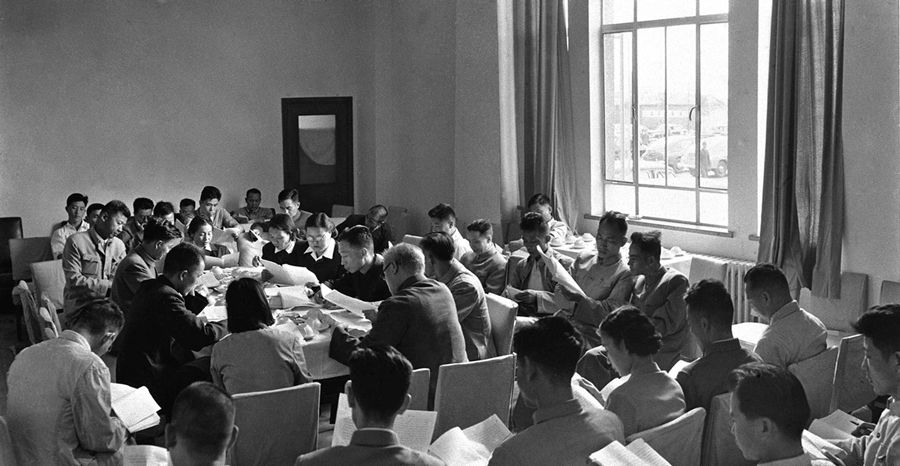 參加大會的代表在小組會上討論大會的報告。新華社圖片