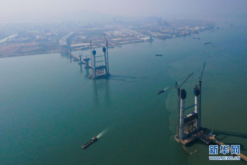 2021年2月2日,深中通道橫門大橋兩端的非通航孔橋?qū)⑹褂?0米混凝土箱梁(無人機(jī)照片)。當(dāng)日,深中通道項(xiàng)目首榀60米混凝土箱梁在位于中山市馬鞍島的中鐵大橋局深中通道項(xiàng)目智慧梁場(chǎng)澆筑成功。新華社記者 劉大偉 攝