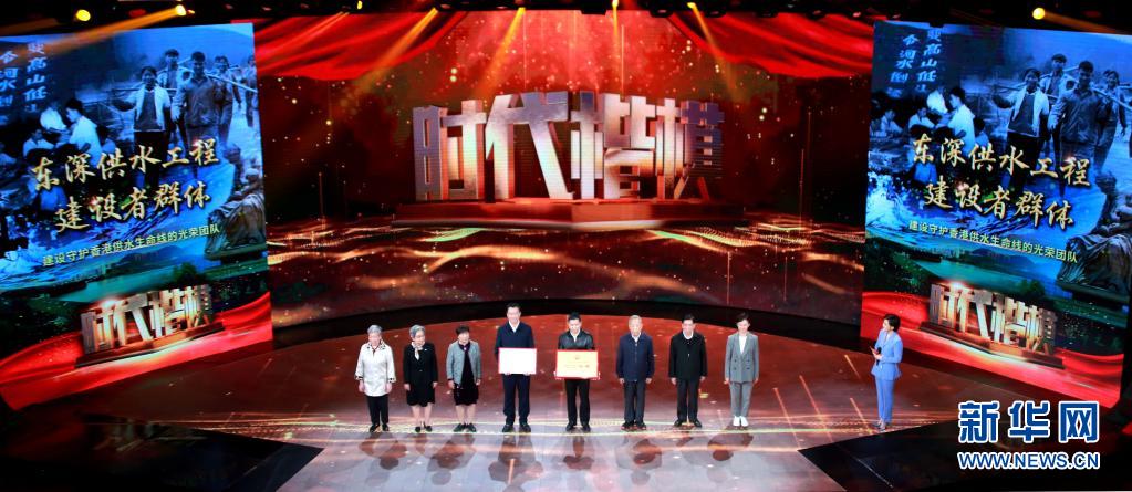 東深供水工程建設(shè)者群體代表在“時(shí)代楷?!卑l(fā)布儀式上領(lǐng)取“時(shí)代楷模”獎(jiǎng)牌和證書(2021年4月18日攝)。新華社記者 潘旭 攝