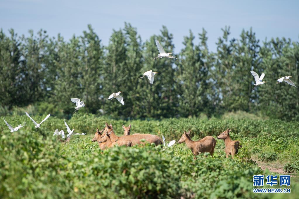 這是2020年8月7日在湖南岳陽(yáng)東洞庭湖麋鹿和鳥(niǎo)類救治避難中心拍攝的麋鹿和飛鳥(niǎo)。新華社記者 陳思汗 攝