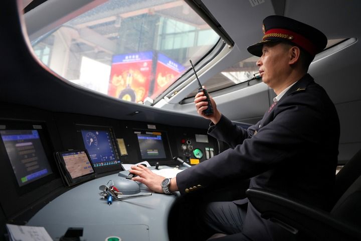 2月21日,国铁南昌局福州机务段动车组司机陈承仪确认列车发车前各仪表仪器显示状态。新华社发