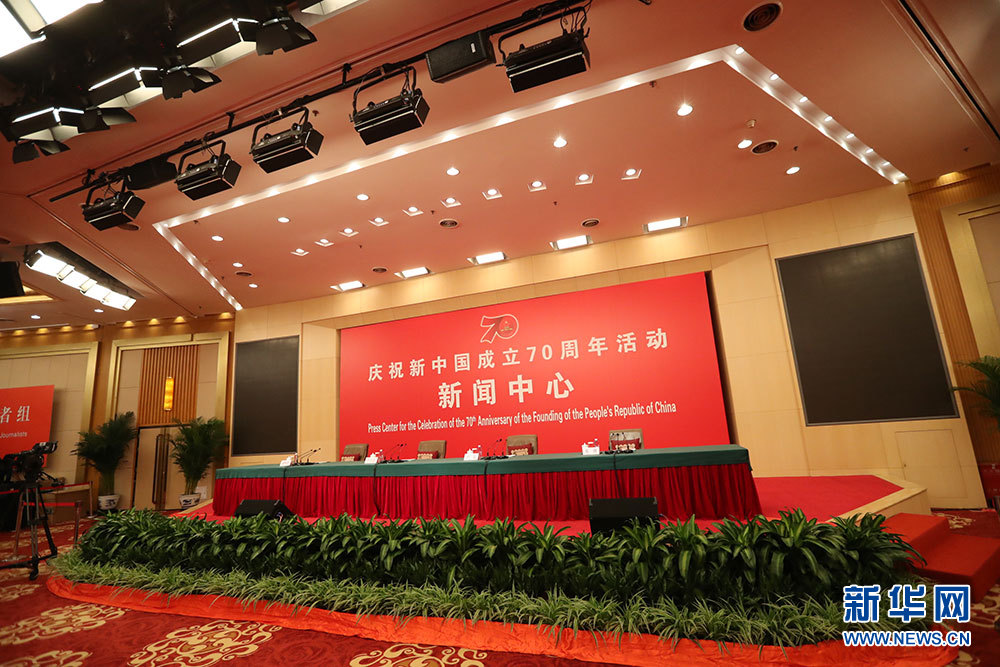 9月24日,慶祝中華人民共和國成立70周年活動新聞中心在北京梅地亞中心二層新聞發(fā)布廳舉辦第一場新聞發(fā)布會。圖為新聞發(fā)布會開始前的現場 。新華網記者 陳競超 攝?