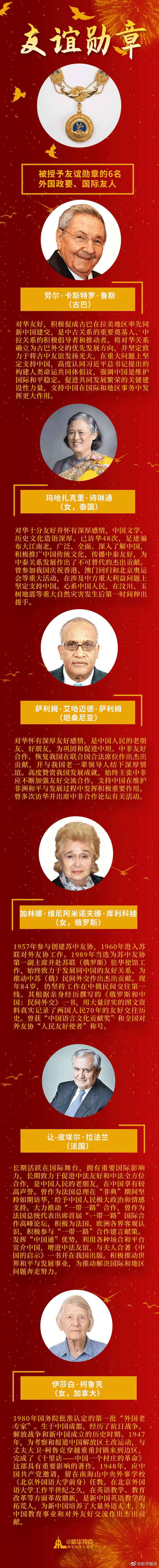 勞爾·卡斯特羅·魯斯、瑪哈扎克里·詩琳通等6人被授予“友誼勛章”。他們與中國結(jié)下不解情緣,留下一段段佳話。為他們點贊? ????