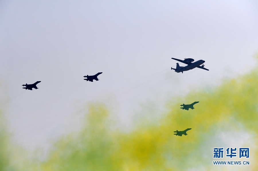 預(yù)警指揮機(jī)梯隊(duì)由空警-500、空警-200預(yù)警機(jī)和運(yùn)-8指通機(jī)作為領(lǐng)隊(duì)機(jī),分別由4架殲-11B戰(zhàn)機(jī)護(hù)衛(wèi)。