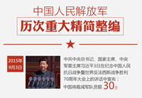 中共中央總書記、國家主席、中央軍委主席習(xí)近平3日在紀念中國人民抗日戰(zhàn)爭暨世界反法西斯戰(zhàn)爭勝利70周年大會上的講話中宣布:中國將裁減軍隊員額30萬。