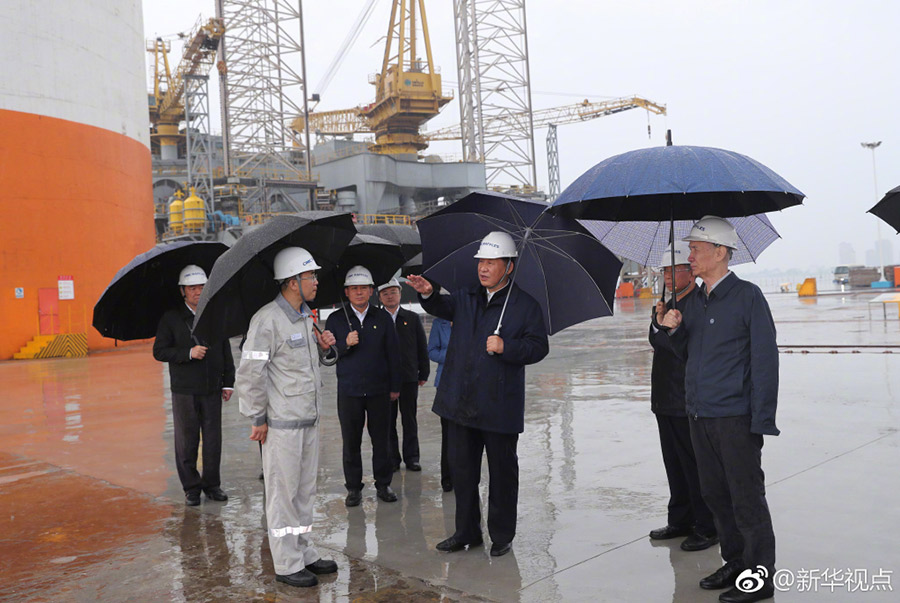 6月13日下午,習近平冒雨來到中集來福士海洋工程有限公司煙臺基地。“藍鯨1號”鉆井平臺巍峨佇立、“泰山”龍門吊高聳入云,習近平撐著傘邊走邊看,詳細了解企業(yè)走自主創(chuàng)新發(fā)展之路、開展高端海洋工程設備自主設計研發(fā)制造情況。聽說“藍鯨1號”去年創(chuàng)造了可燃冰開采時間和產(chǎn)量兩項世界紀錄,習近平鼓勵他們繼續(xù)努力??倳浲F(xiàn)場的工人們一一握手,他說,基礎的、核心的東西是討不來買不來的,要靠我們自力更生、自主創(chuàng)新來實現(xiàn)。我看你們有這個信心,希望你們迎難而上、再接再厲。(記者張曉松、謝環(huán)馳)