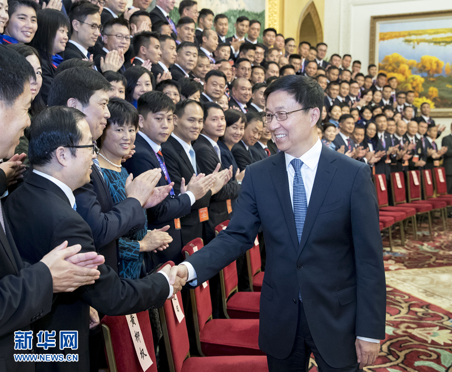 8月27日,中共中央政治局常委、國務(wù)院副總理韓正在北京人民大會堂會見香港特別行政區(qū)保安局局長李家超率領(lǐng)的香港紀(jì)律部隊文化交流團(tuán)全體成員。 新華社記者王曄攝
